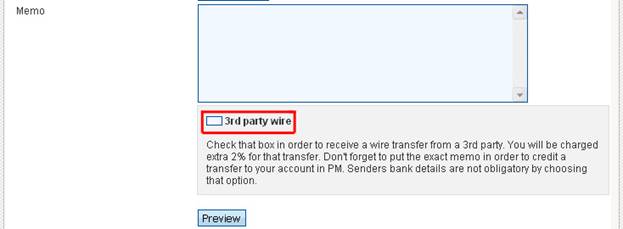 If you would like to receive bank wires into your PM account from third parties, please pay attention to the field that requires you to put a check "V" next to this option. The illustration of this is presented bellow. In order to receive bank wires from third parties, you will have to present your ID (passport or driving license) for authorization purposes.